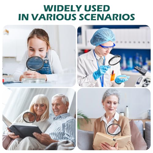 • LARGE CLEAR OPTICAL GRADE LENS: This 5.2 inch magnifying glass accessory showcases shatterproof and scratch-resistant glass lenses, offering a clear and distortion free image. Its magnified effect is particularly beneficial for the elderly and those with low vision, making it easy to hold and read books, magazines, view photographs, maps, electronic devices, miniatures, jewelry, pill bottles, and medication labels, and engage in hobbies and crafts.