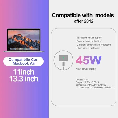 • ANDHOT Compatible avec le chargeur Mac Book Air:Entierement compatible avec le chargeur Mac Book Air 11 po et 13 po (2012 2013 2014 2015 debut). Mac Book Air (13 pouces, mi-2012); Mac Book Air (11 pouces, mi-2012); Mac Book Air (13 pouces, mi-2013); Mac Book Air (11 pouces, mi-2013); Mac Book Air (13 pouces, debut 2014); Mac Book Air (11 pouces, debut 2014); Mac Book Air (13 pouces, debut 2015); Mac Book Air (11 pouces, debut 2015); Mac Book Air (13 pouces, 2017). Compatible avec Mac Book Air A1465, A1436, A1466.