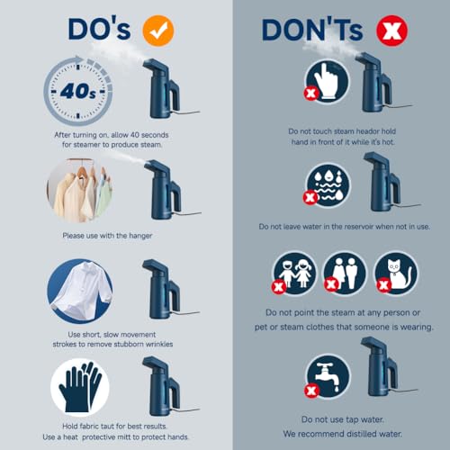 - [180ML Water Tank] The 180ML large capacity water tank allows for steaming 3-5 garments per fill, this clothes steamer is suitable for home use while the compact size ensures easy storage and portability for travel. Please be careful not to fill above the “max” water level and use distilled water for optimal performance