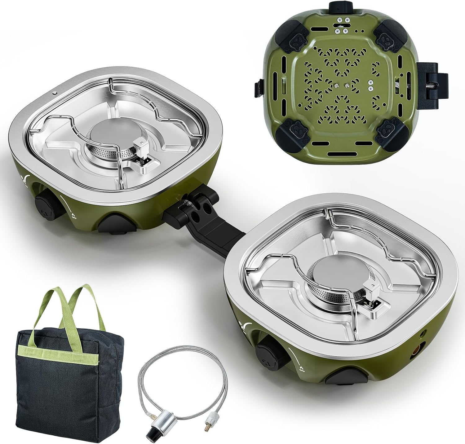 This portable dual-burner camping stove delivers up to 20,000 BTU combined, giving you fast boiling, powerful frying and efficient grilling wherever you go. With independently adjustable burners and a steady flame output, you can cook a full meal while brewing coffee at the same time—perfect for multi-tasking outdoors. Compact at just 9.7 × 9 × 5.6 inches and only 5 lbs, it includes a built-in carry handle and a woven storage bag for easy transport on hikes, camping trips, RV travels and outdoor gatherings. Made from durable 304 stainless steel, it resists rust and corrosion and wipes clean with a cloth. One-hand ignition makes setup instant, while non-slip feet ensure safe cooking. Designed with a circular cooktop that fits two 12-inch pans, it also features bottom air vents, deep wind-resistant grooves and an extended gas hose for safe, efficient performance. A thoughtful, reliable gift for any outdoor enthusiast.