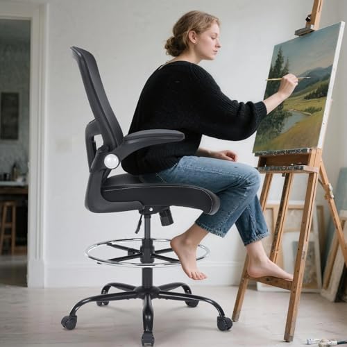 - ?Adjustable Tall Office Chair?: This drafting chair features 90? flip-up armrest, which can save a certain amount of space; Adjustable seat height from 22.83-30.31 inches, very suitable for standing desks, sitting desks and bars; It also has 90?-120? rocking mode and 360? rotation caster