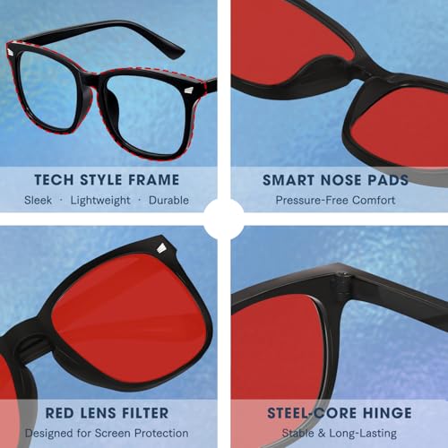 - ?Red Glasses for Screen Use & Gaming Comfort?Stay focused and comfortable with red glasses, designed to ease eye fatigue during extended computer or gaming sessions. These red lens glasses soften harsh light and improve clarity — perfect for study, work, or late-night gaming.