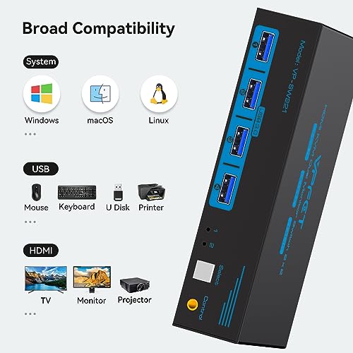 - HDMI KVM USB 3.0 Switch: In addition to two HDMI ports, this KVM switch also has four USB 3.0 ports with a data transfer rate up to 5Gbp/s, which is 10 times faster than USB 2.0 ports. USB 2.0 devices are compatible. It can be used to share USB devices such as printers, scanners, webcams, wired or wireless keyboards and mice, and more. Use of high-power USB devices requires use of the supplied 12V power supply. Support Windows/Vista/XP and Mac OS, Linux and Unix and other systems