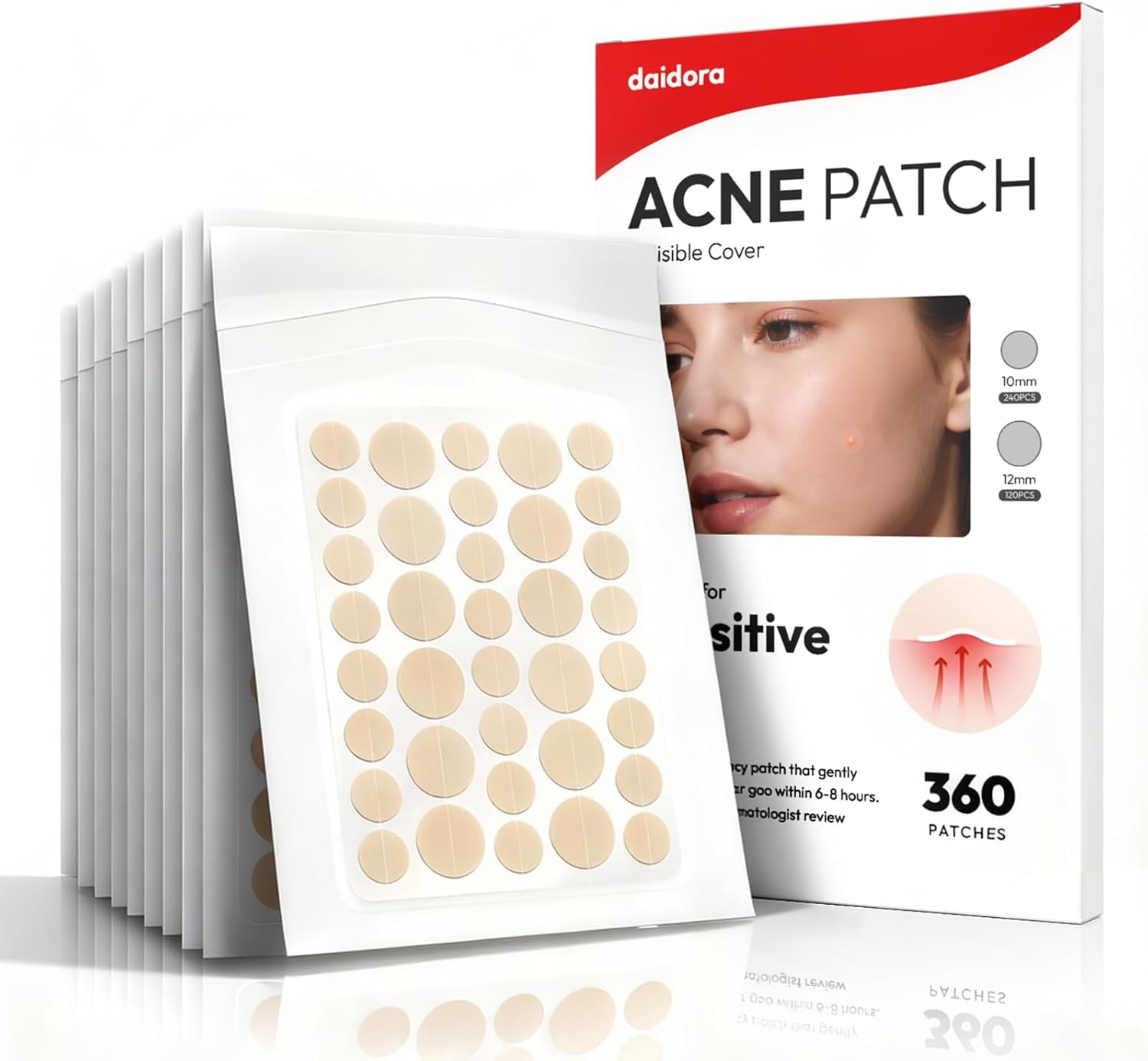 Includes 120 × 12 mm and 240 × 10 mm patches, providing targeted coverage for pimples of all sizes and comparable to professional anti-blemish patches.