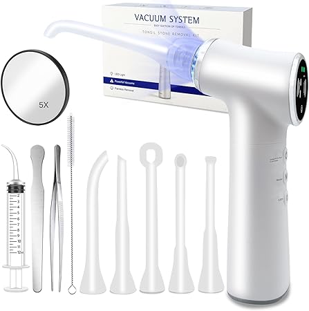 This electric tonsil stone remover combines safety, comfort, and effectiveness for at-home use. Featuring 5 types of glass and silicone probes with varied tip shapes, it ensures a customized and gentle removal experience. The device uses advanced vacuum adsorption technology, delivering adjustable suction power from gentle to strong for efficient stone extraction. Equipped with an 800mAh rechargeable battery, it provides up to 4 hours of continuous use on a single charge. Easy to operate and maintain, the kit includes a syringe for flushing and comes with clear instructions for safe, painless, and effective tonsil stone removal.