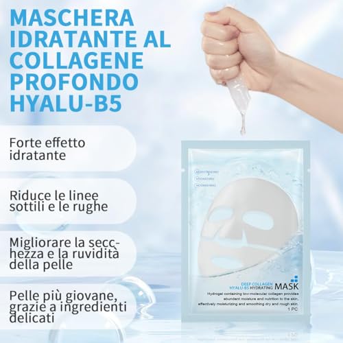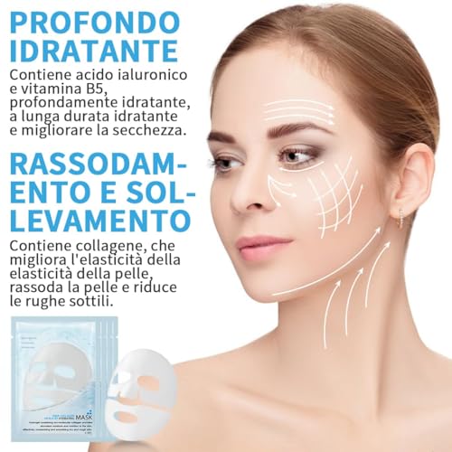 • ?Lenitivo e Idratante?La maschera collagene viso e ricca di idratanti,che formano una pellicola protettiva che trattiene l’idratazione cutanea e la mantengono idratata e morbida a lungo.Allo stesso tempo,la maschera al collagene ha anche un effetto lenitivo e puo alleviare secchezza,tensione e altri fastidi cutanei,donando alla pelle una sensazione di comfort e luminosita.