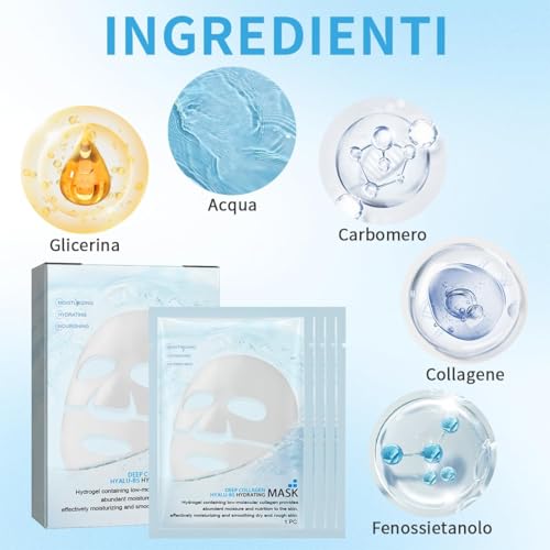 • ?Ingredienti Naturali?La maschera collagene viso e composta da ingredienti naturali,contiene acido ialuronico per idratare profondamente la pelle,che favoriscono l’assorbimento,sono delicati e non irritanti,rimpolpandola visibilmente e mantenendo l’idratazione per un colorito giovane ed elastico.