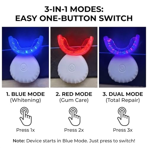 - Operation & Mode Switching One-Button Control (How to Switch Modes): Designed for simplicity. Long press or place in mouth to activate the smart sensor. Short press the button to cycle through the 3 modes: 1. Blue Light (Whitening) -> 2.Red Light (Gum Care) -> 3. Dual Light (Comprehensive). Please Note: The device may default to Blue Light upon startup; simply press the button to reach your desired Red Light setting.