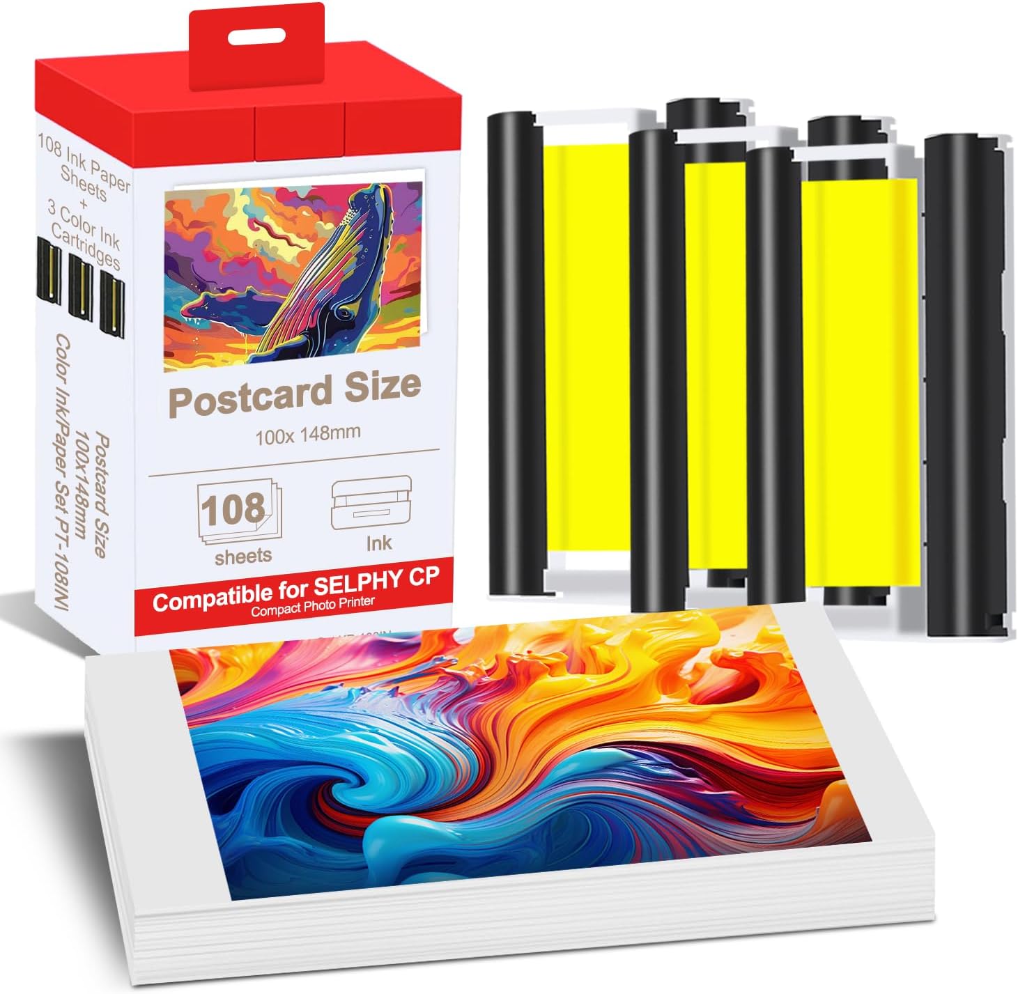 This value pack is designed to work seamlessly with Canon Selphy series photo printers, including CP1500, CP1300, CP1200, CP1000, CP910, CP900, CP800–CP820 and many more. It is not compatible with Kodak HP photo printers. The package includes 3 compatible KP-108IN color ink cartridges and enough photo paper for 108 vibrant postcard-size prints (100 × 148 mm / 4″ × 6″).