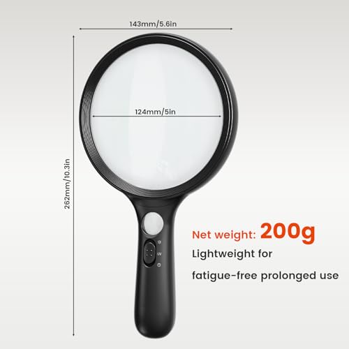 - Large 5″ Anti-Distortion Lens & Ultra-Lightweight: Enjoy a wide, distortion-free view without the arm fatigue. The generous 5-inch lens offers a broad field of vision for reading entire paragraphs or examining large maps. At just 200g, it’s over 40% lighter than most competitors, making it exceptionally comfortable for prolonged use