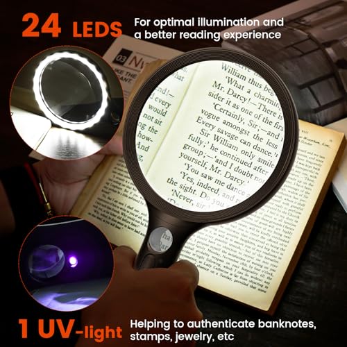 - Ultra-Bright LED Illumination with UV Detection: Read clearly in any lighting condition. 24 energy-efficient LEDs bathe your reading material in bright, even light, eliminating shadows and glare. Plus, the built-in UV light is your secret tool for verifying security features on currencies, stamps, and official documents