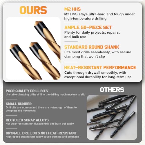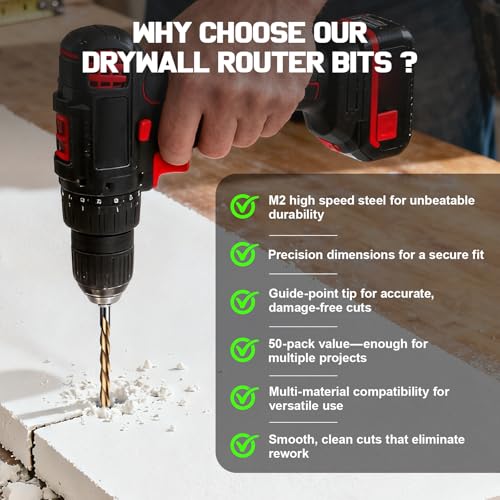 - ?50 BITS | TOOL-READY & PRECISION-MADE?50pcs drywall router bit easy to attach to power tools, this set empowers DIYers to achieve professional results–thanks to superior strength, sharpness, and precise sizing–all in one box.