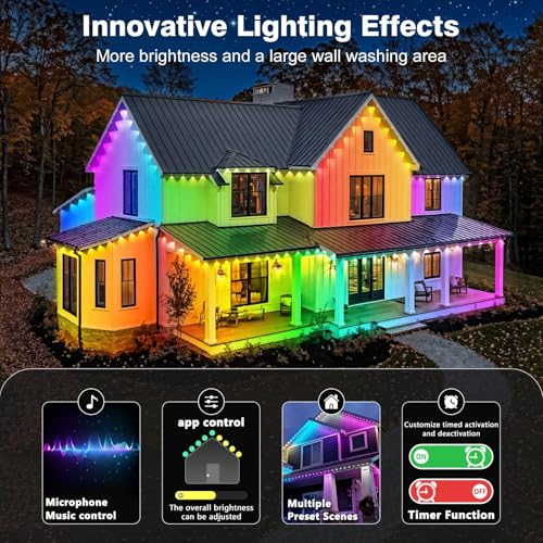 - ?Super Bright & Versatile?Experience 3X the brightness with our under eaves outdoor led lights–each LED packs up to 100 lumens, ensuring your space stays vivid and visible day or night. They’re perfect for every moment: switch to vibrant color effects to deck out your home for holidays, or use the adjustable warm white tone (2700K-6500K) for soft, everyday illumination that fits your vibe. Plus, the built-in timer takes the hassle out of daily use–set it once, and the lights will automatically turn on at night and off during the day, so you can enjoy the glow without lifting a finger.