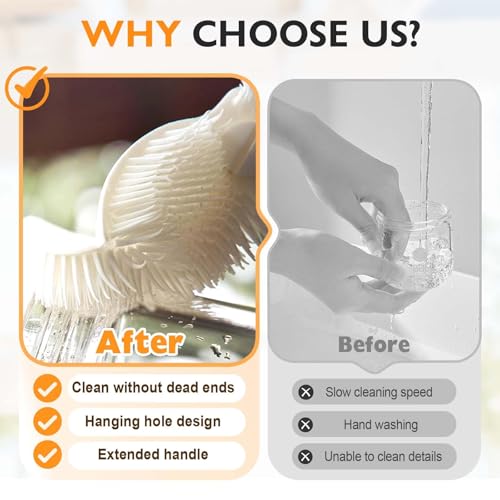 • 360? Flexible Deep Cleaning Power:Our 360? Flexible Silicone Bottle Brush with Long Handle effortlessly cleans narrow-neck bottles and deep containers. The soft, dense bristles scrub away residue without scratches, ensuring deep cleaning for your delicate glassware and baby bottles