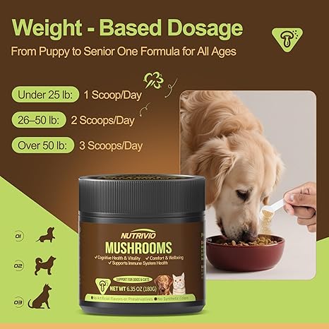 Crafted from 100% organic, non-GMO mushrooms with no grains, fillers, or artificial ingredients. Suitable for daily use and safe for pets of all sizes and breeds.