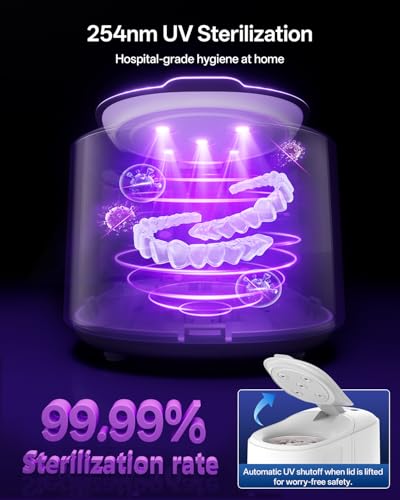 - UV Light&45kHz Ultrasonic Deep Clean:Powered by 45kHz ultrasonic tech, this oral appliance cleaner targets dirt at a microscopic level, loosening even the toughest tartar and stains. UV lights work in harmony to neutralize odors. Each cleaning does more than remove debris — it adds an invisible shield to protect your oral health.