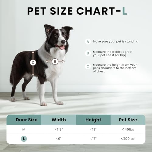 - Find the Perfect Fit for Your Dog: Please carefully review the size chart in the photo to ensure your puppy/kitty can pass through comfortably. The flap opening is 17.3″ x 9.45″. Suitable for pets up to 100 lbs. This plastic dog door fits doors or walls between 3.35″-7.48″ thick – please confirm your measurements before purchasing
