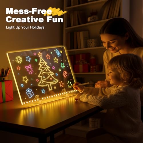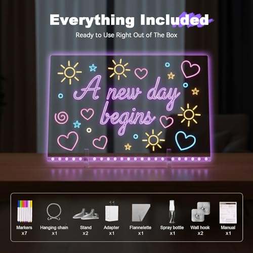 • Upgraded Scratch-Resistant Surface & Full Toolkit: Crafted with polished acrylic, this LED drawing board for kids resists scratches and includes 7 water-soluble markers, 2 invisible stands, a cleaning spray, a adapter, soft cloth, and hanging chain with hooks. Reuse it endlessly and enjoy mess-free creativity!