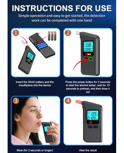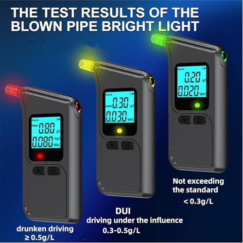 • Utilisation simple & Avertissement automatique: Inserez trois piles AAA(piles non incluses), puis maintenez le bouton d’alimentation pendant trois secondes. Apres une phase de prechauffage de dix secondes, soufflez regulierement pendant trois a cinq secondes. L’ecran LCD affiche immediatement les resultats : vert en dessous de 0.3 g/L (conduite consideree comme sure), jaune entre 0.3 g/L et 0.5 g/L (prudence), rouge au-dessus de 0.5 g/L(interdiction totale de conduire). Un controle rapide de votre aptitude a conduire en seulement 15 secondes. A partir d’un taux >= 0.5 g/L, l’ecran affiche <> accompagne d’une alarme sonore.