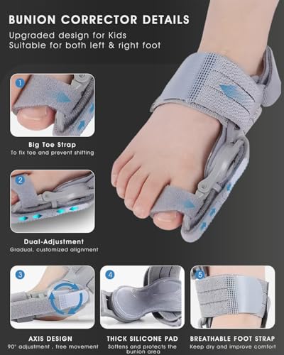 • ?Freedom to Move Without Pressure?The bunion corrector features a rotating joint at the big toe, allowing free movement and maintaining healthy blood circulation. It’s comfortable for walking short distances, playing at home, or even sleeping. The big toe straightener works gently without limiting your child’s mobility or daily routine.