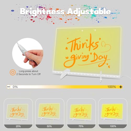 - Colorful lighting, creating atmosphere: Acrylic dry erase board built-in 7 RGB color lights and 4 lighting effect modes (constant light, breathing, flashing, gradient), which can be switched freely according to the environment and mood. Suitable for night reminders, holiday decorations or children’s fun space layout, creating an immersive atmosphere, making every creation more vivid and eye-catching