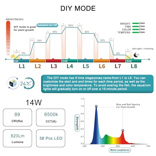 • Three modes (day, night and DIY mode) : In day mode, the light simulates the changes in light throughout the day. The light slowly becomes brighter, then gradually dims and disappears. In night mode, you can choose the color of the light. DIY mode has 8 time periods from L1 to L8, and you can set the time, brightness, color and color temperature. All modes have a 3-minute gradual rise or fall process when the light changes, which does not alarm fish creatures