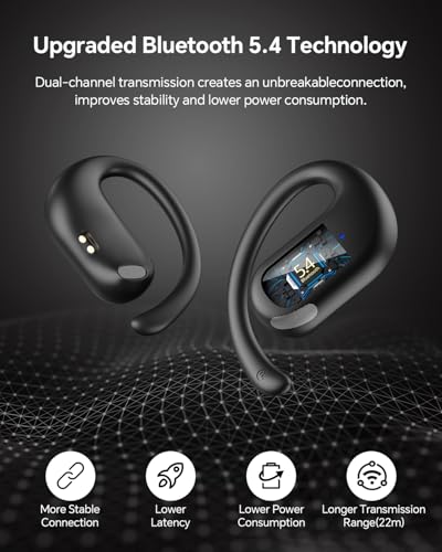 - ? Bluetooth 5.4 & ENC Call Clarity & Touch Control: With Bluetooth 5.4 in these open ear buds pairing is 30% faster and connection is 50% more stable than previous versions–even in crowded spaces. The ENC microphone in these open ear earbuds wireless bluetooth reduces background noise by 80%, making calls as clear as face-to-face conversations. Effortlessly control it all with a tap–the smart touch control lets you manage music and answer calls directly on the headphones.