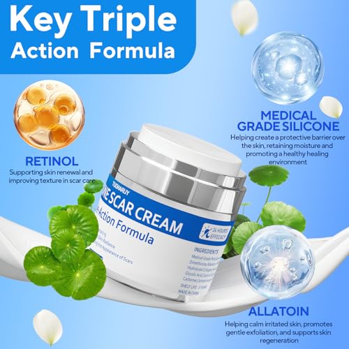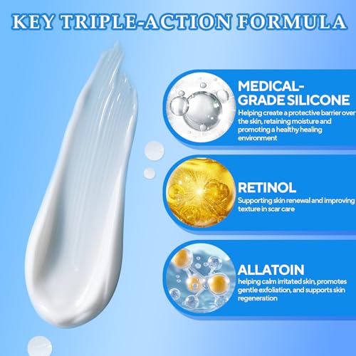 - TRIPLE ACTION FORMULA SCAR TREATMENT: Our advanced scar cream features a powerful blend of medical-grade silicone, retinol, and allantoin to target scars from multiple angles. This silicone scar cream helps deeply hydrate the skin, promote skin renewal, and visibly smooth and soften scar texture. It gradually makes scars appear flatter and less noticeable–revealing healthier-looking skin over time