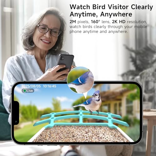 • ?2K Ultra HD Camera with 160? Wide View? Enjoy immersive birdwatching with 2K resolution (2304×1296), a 160? ultra-wide field of view, and a 2.8in Focus, close-up bird details–capturing smooth, vibrant footage day or night.