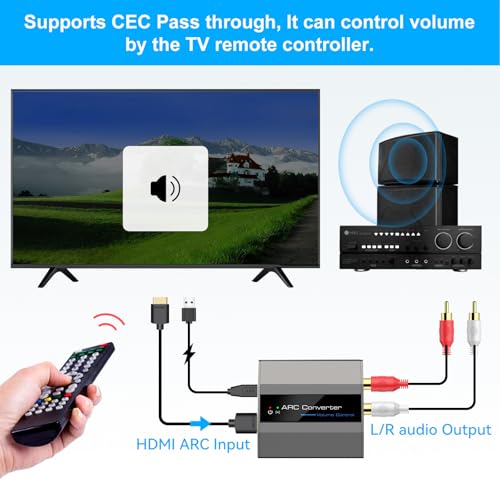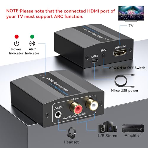 - ?HDMI ARC Audio Converter?The Audio Converter can send the sound from ARC-enabled TVs back to the adapter’s L/R channel and 3.5mm headphone port via the HDMI ARC connector, solving the problem that TVs without an audio output connector can’t be connected to a sound system.
