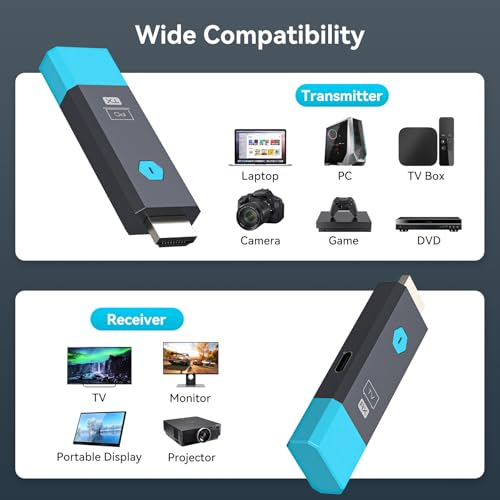 • ?Lightweight and Compatible, Seamless Connectivity?This hdmi wireless transmitter combines a compact design (0.1 lbs) with broad compatibility, effortlessly connecting to PCs, laptops, cameras, camcorders, TV boxes, projectors, monitors, and HDTVs. It deploys quickly for outdoor meetings and home entertainment