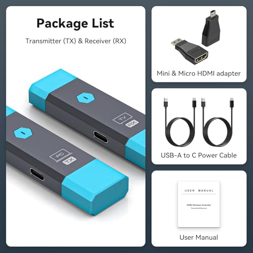 • ?Accessories + After-Sales?The package includes an HDMI transmitter and HDMI receiver, 2*USB A-C power cables, 1*Mini HDMI to HDMI adapter, 1*Micro HDMI to HDMI adapter, and 1*user manual. We offer a 12-month warranty. If you encounter any issues, please contact us first