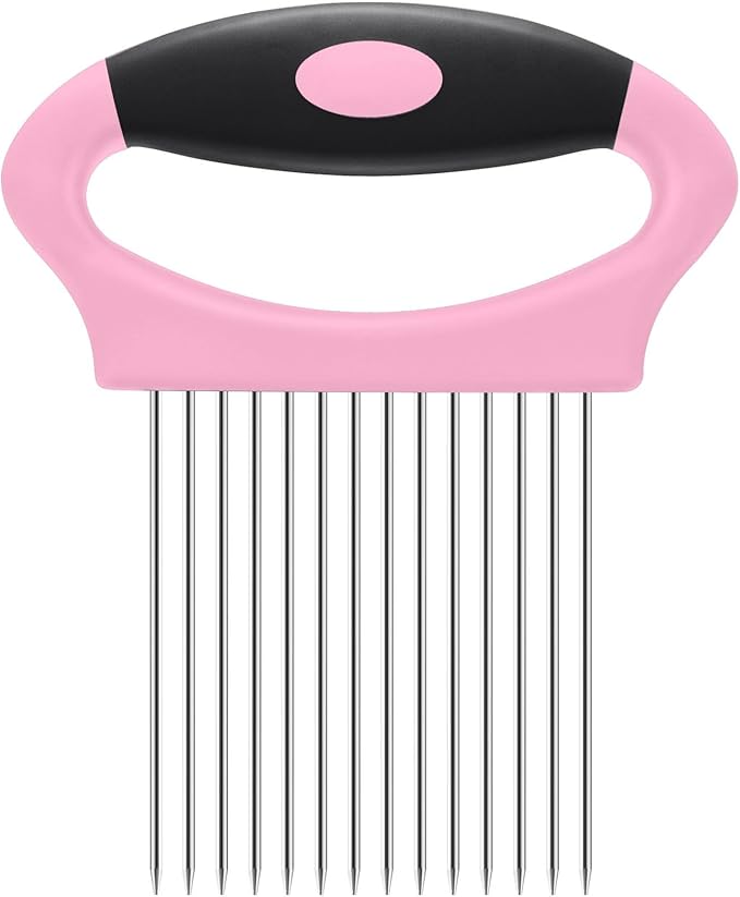 The YUNHOME large onion slicer holder features 14 ultra-sharp stainless steel prongs and a comfortable upgraded ABS handle, making it the perfect onion cutter and vegetable chopper for slicing onions, tomatoes, lemons, or tenderizing meats. This versatile kitchen gadget ensures even, consistent slices for all your meal prep needs.